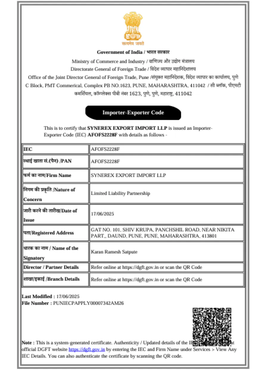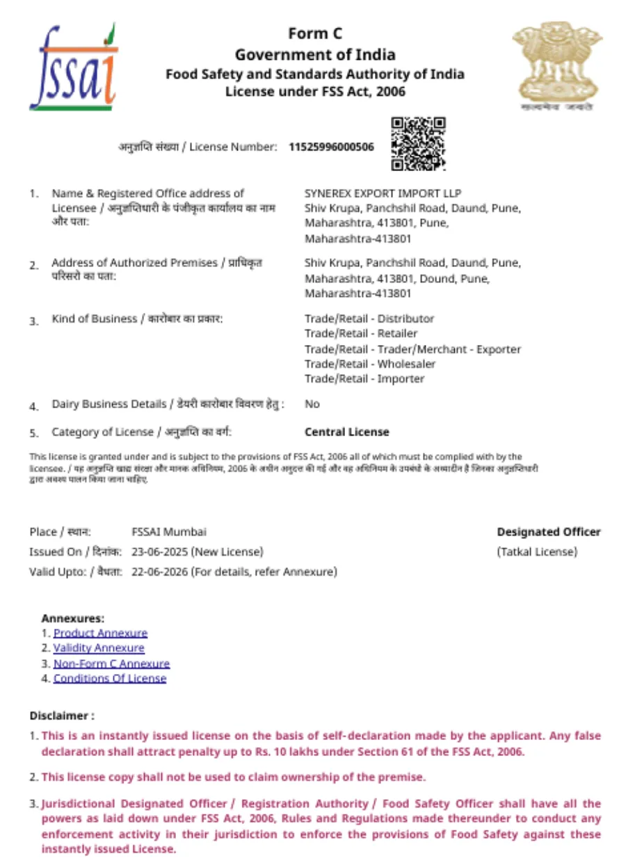 At SynerEx Export Import LLP , we are committed to delivering premium-quality food products to our global clientele. To maintain international standards and ensure food safety, we comply with globally recognized certifications.